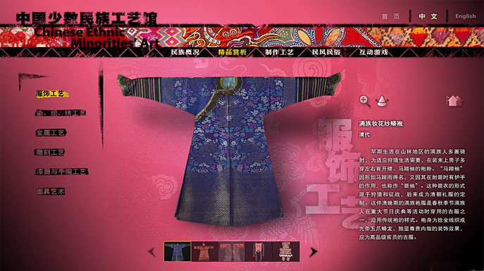 This product is a touchscreen guided tour of the hall dedicated to ethnic minorities’ craftsmanship. It includes a Chinese version and an English one. The content has been subdivided into five main sections visitors can use as they please in order to optimize their tour: general introduction, introduction of the most interesting items, craftwork fabrication process, folk customs and interactive game.